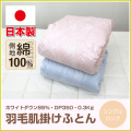 ホワイトダウン85%の羽毛肌掛けふとん。着心地にこだわり、側生地には綿100%の60サテン生地を使用しました。