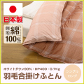 朝晩は冷える春秋にピッタリな、上質なフランス産ホワイトダウン90%を使用した羽毛合掛けふとん。着心地にもこだわり、側生地には綿100%の80サテン生地を使用しています。